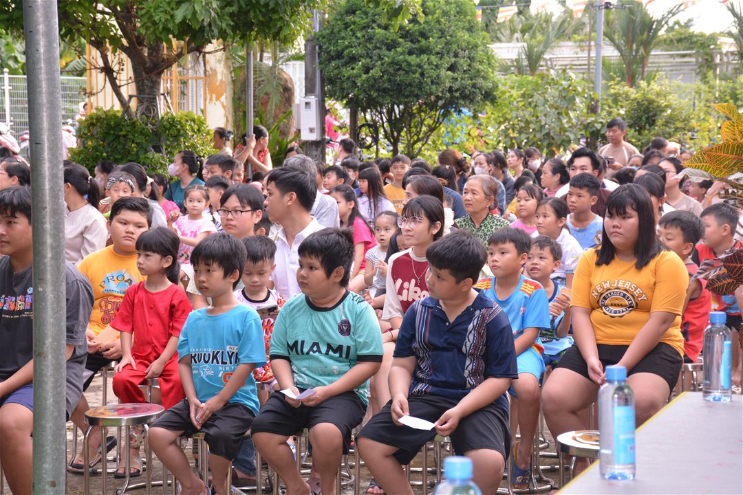 Từ buổi chiều, sân chùa rực rỡ sắc màu của đèn lồng và tiếng cười vui tươi của các em nhỏ. Các hoạt động như trò chơi dân gian, múa lân, tặng quà Trung thu, bánh kẹo, sữa và lồng đèn được tổ chức chu đáo, mang đến niềm vui và tiếng cười cho các em.