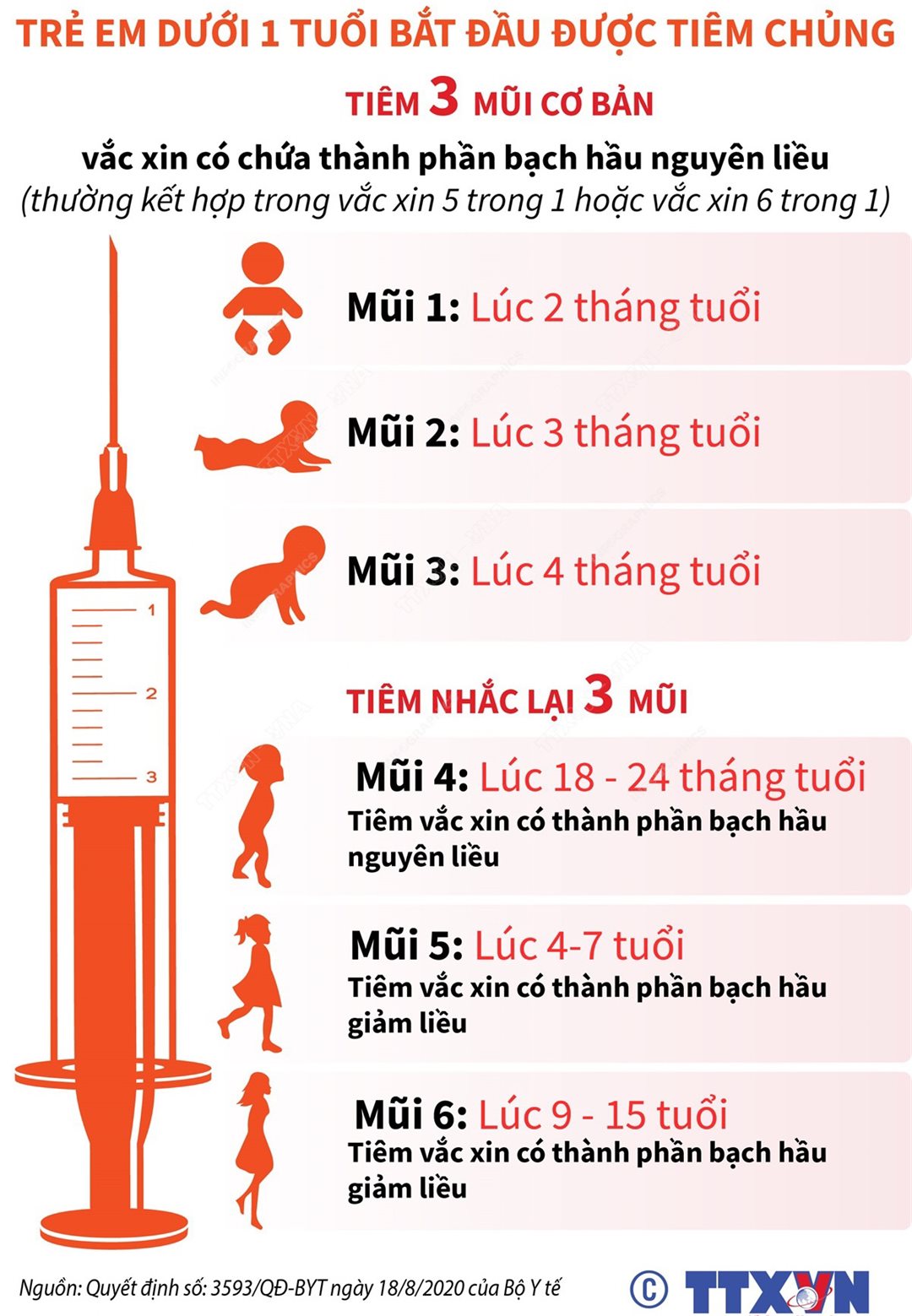 - Phòng bệnh bằng vaccin bạch hầu: Trẻ dưới 1 tuổi: tiêm 3 mũi cơ bản (2, 3, 4 tháng tuổi), nhắc lại ở 18–24 tháng, 4–7 tuổi, 9–15 tuổi. Trẻ lớn & người lớn chưa tiêm: cần tiêm đủ 3 mũi cơ bản và nhắc lại theo quy định.