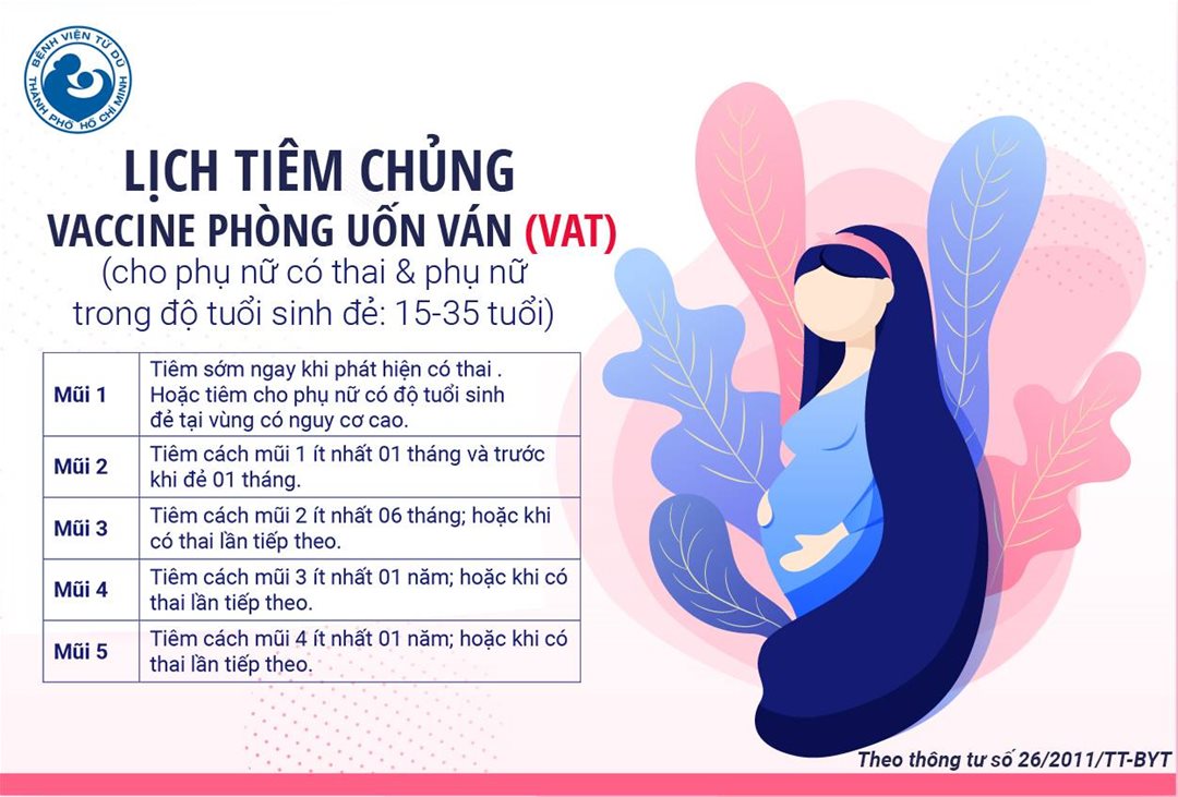 Lịch tiêm ngừa uốn ván cho phụ nữ mang thai: mũi 1 càng sớm càng tốt khi có thai lần đầu hoặc tiêm ngừa cho nữ độ tuổi sinh sản (15-35 tuổi) ở vùng có nguy cơ cao; mũi 2 sau mũi 1 ít nhất 1 tháng; mũi 3 sau mũi 2 ít nhất 6 tháng hoặc ở lần có thai sau; mũi 4 sau mũi 3 ít nhất 1 năm hoặc trong kỳ có thai sau; mũi 5 sau mũi 4 ít nhất 1 năm hoặc trong kỳ có thai sau. Không có khoảng cách tối đa giữa các mũi tiêm uốn ván.