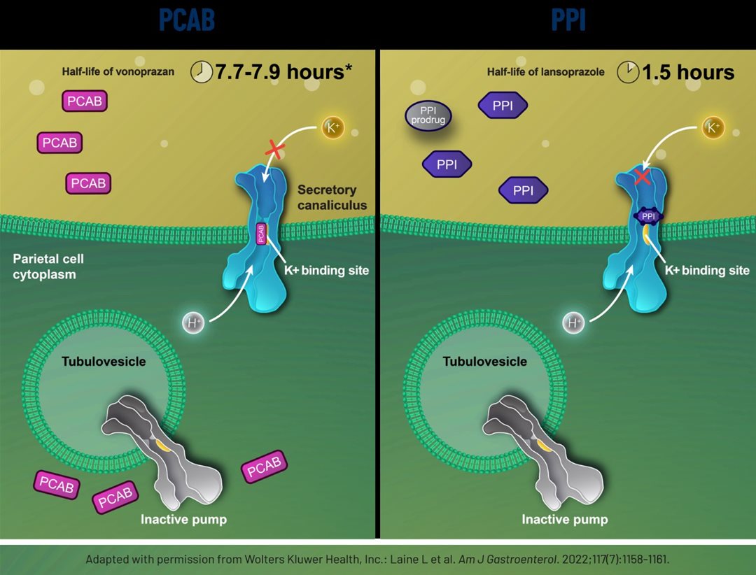 For many years, proton pump inhibitors (PPIs), such as omeprazole and lansoprazole, have been considered the “gold standard” in the treatment of acid-related gastrointestinal disorders. However, PPIs still have pharmacokinetic limitations, including delayed onset of action, short half-life, and interindividual variability in metabolism via CYP2C19. P-CABs have emerged as a potential alternative, with a distinct and more advantageous mechanism of action.