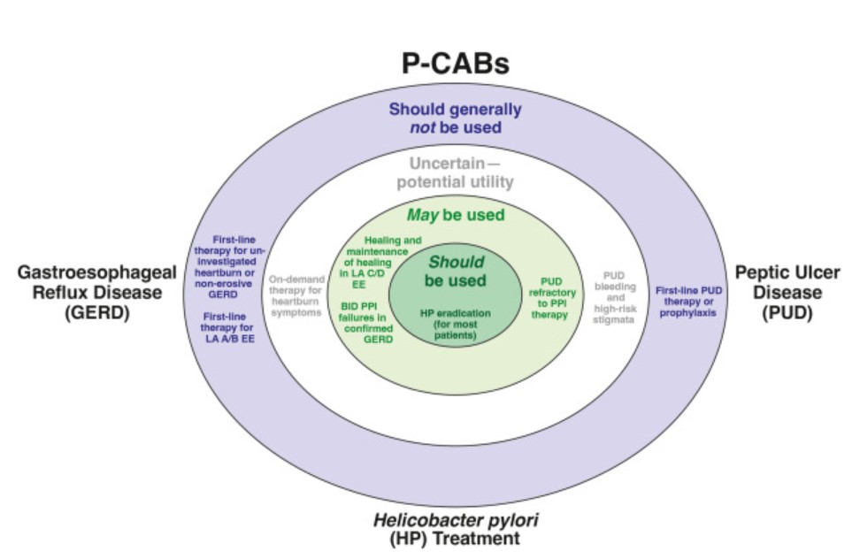 Figure 2. Best-practice advice on the use of P-CABs in foregut disorders, with a focus on GERD, H. pylori treatment, and peptic ulcer disease (PUD). From the outer ring to the center, the figure illustrates clinical scenarios in which P-CABs should not be used, may have potential use pending further data, may be used, and should be used in most patients.